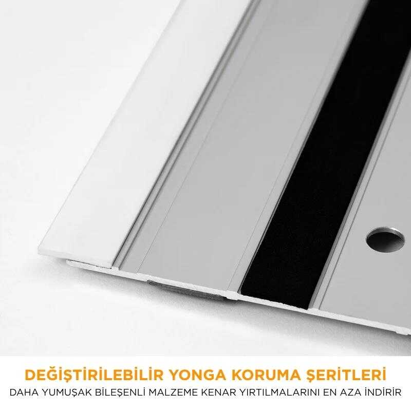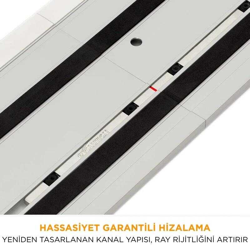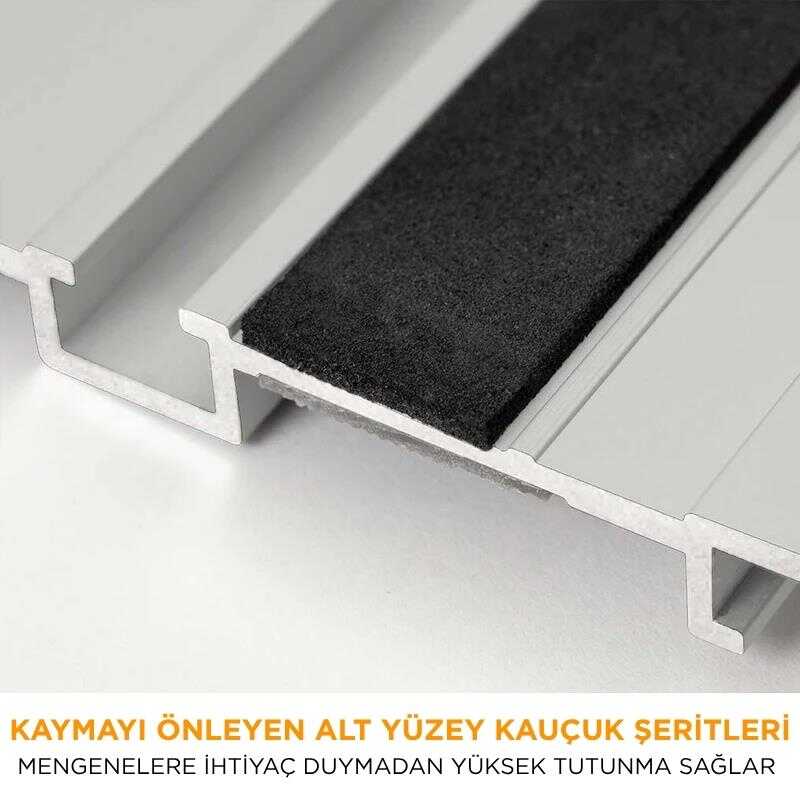 ● Alt kısımda, geliştirilmiş yüksek tutunma özellikli kauçuk şeritler kullanılmıştır; bu sayede ray, mengenesiz kullanımda bile yüksek stabilite sağlar.