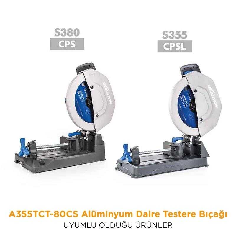 ● Evolution A355TCT-80CS, 355mm çapında, 80 dişli Tungsten Karbür Uçlu (TCT) alüminyum kesimi içim Evolution 355 mm metal profil kesme ve metal gönye testereleriyle uyumlu, daire testere bıçağıdır.
